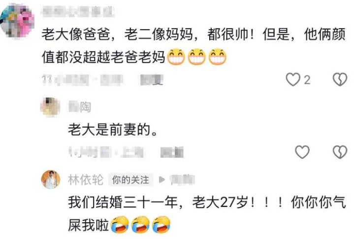 而在这条驳倒下有网友还暗示林依轮大犬子并不是他与西华生的,而是与前妻生的,没思到林依轮还回复了,他写说念:“咱们成婚三十一年,老迈27岁,你气死我啦”,由此可见大犬子亦然他和西华所生。